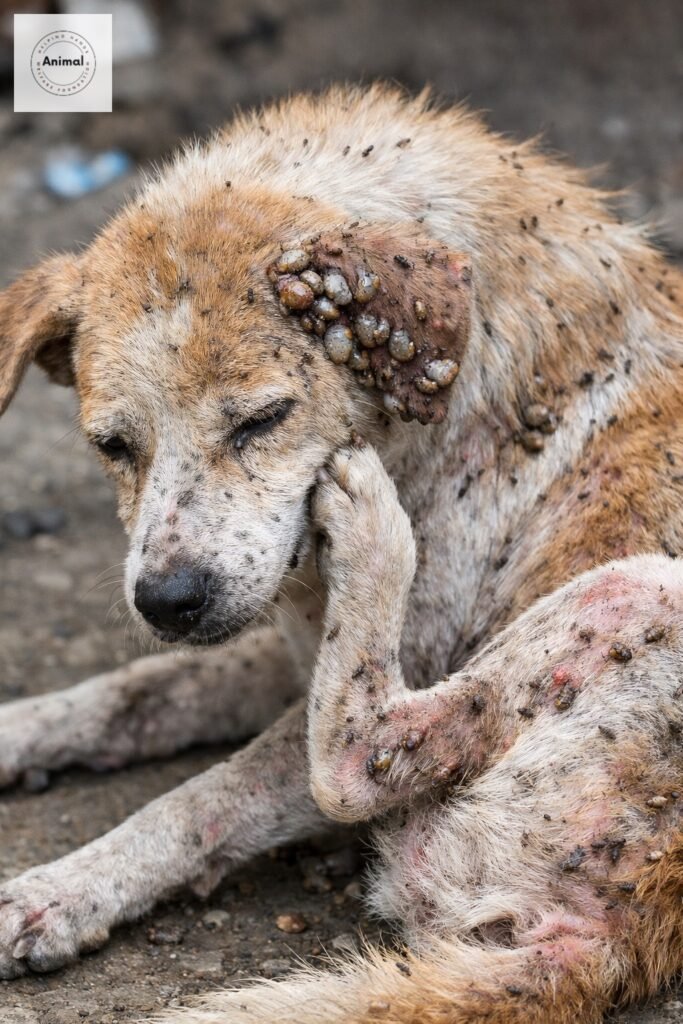 - Visible ticks attached to the skin, often around ears, neck, and paws